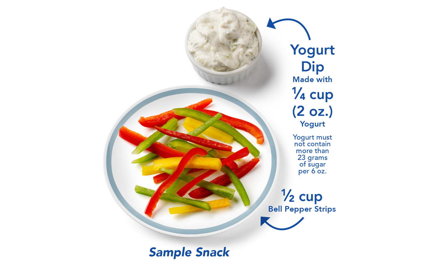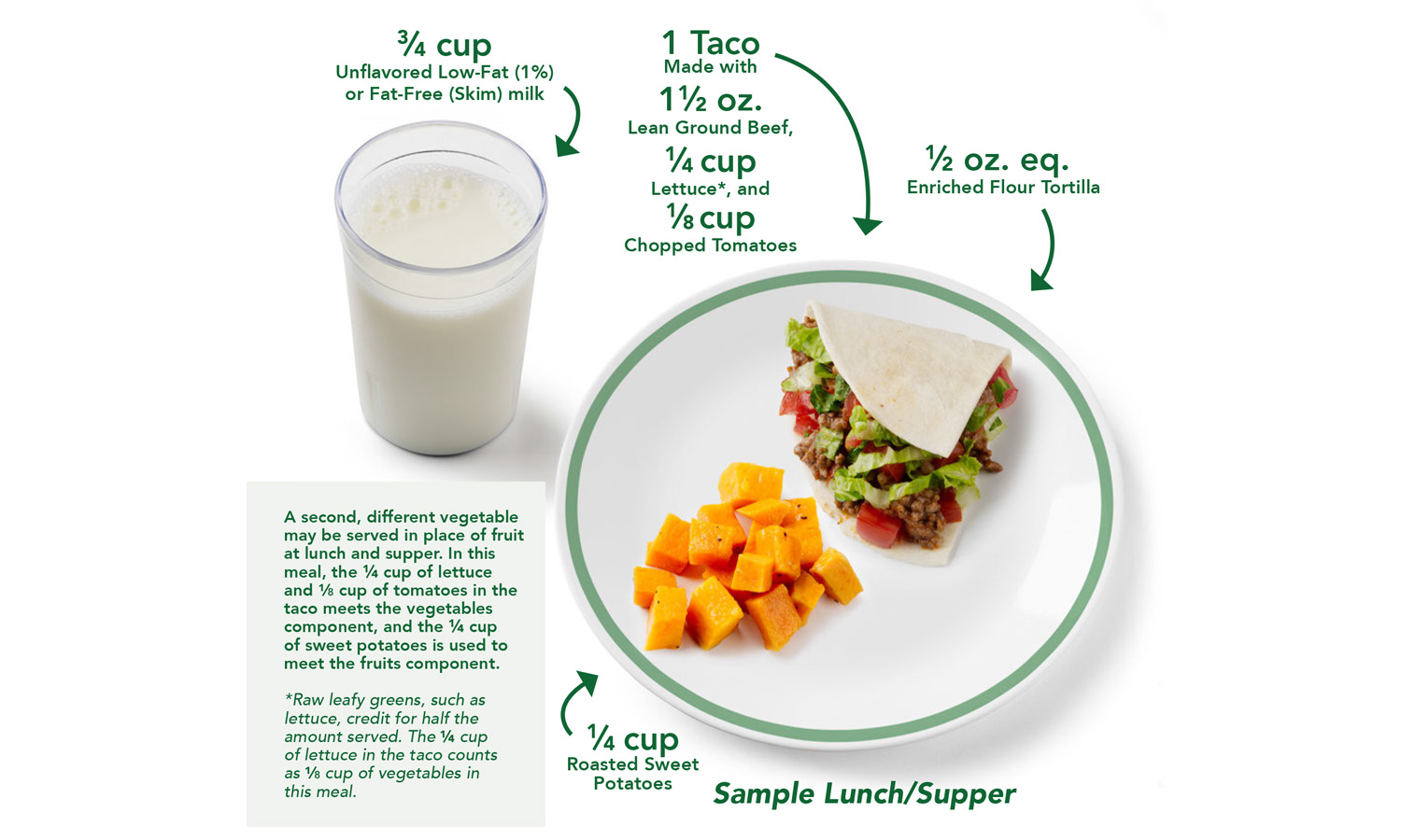 | Breakfast | Vegetables, Fruit or Both | 1/4 Cup | 1/2 Cup | 1/2 Cup |